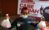 Warga memperlihatkan cabai dalam kantong plastik saat operasi pasar cabai murah untuk pelaku Usaha Mikro Kecil Menengah (UMKM) di Kediri, Jawa Timur, Jumat (12/3/2021). Pemerintah daerah setempat menyiapkan 300 kilogram cabai rawit merah dengan harga Rp50 ribu per kilogram guna membantu pelaku UMKM kuliner karena tingginya harga cabai di pasaran hingga Rp120 ribu per kilogram. (FOTO : ANTARA/Prasetia Fauzani)