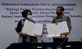 Direktur Corporate Banking Bank Mandiri Susana Indah Kris Indriati (kiri) dan Direktur Pemasaran Pupuk Indonesia Gusrizal menunjukkan nota kesepahaman kerja sama di Jakarta, Jumat (12/3/2021). Melalui Program Agro Solution, Bank Mandiri bersinergi dengan PT Pupuk Indonesia (Persero) dalam pemberdayaan petani binaan melalui pemberian akses permodalan. Pembiayaan ini diberikan kepada kelompok tani yang direkomendasikan Pupuk Indonesia termasuk badan usaha ataupun koperasi yang menjadi (FOTO : ANTARA/Sigid Kurniawan)