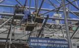 Pekerja menyelesaikan perakitan rangka atap saat pembangunan Jakarta International Stadium (JIS) di Papanggo, Tanjung Priok, Jakarta, Jumat (12/3/2021). Rangka atap tersebut nantinya akan dilengkapi juga dengan fitur (FOTO : ANTARA/Muhammad Adimaja)