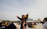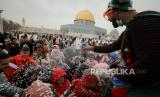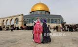 REPUBLIKA.CO.ID, YERUSALEM -- Muslim Palestina merayakan peringatan Isra Miraj Nabi Muhammad SAW, di kompleks Masjid Al Aqsa, Yerusalem, Kamis (11/3). Tampak latar belakang bangunan kubah emas tempat batu yang menjadi pijakan terakhir nabi sebelum berangkat dalam perjalanan Isra Miraj.