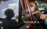 Seorang warga menerima suntikan vaksin COVID-19 secara drive thru (FOTO : Antara/Fauzan)