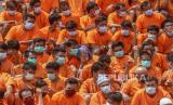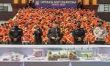 Ratusan orang tersangka penyalahguna, kurir dan bandar narkoba dihadirkan ketika rilis hasil operasi narkoba di Mapolda Riau, Pekanbaru, Riau, Ahad (14/3/2021). Operasi anti-narkoba yang dilaksanakan selama 22 hari terhitung dari 18 Februari hingga 11 Maret 2021 ini berhasil mengamankan sebanyak 463 orang tersangka dengan barang bukti sabu-sabu sebanyak 45,46 kg, ganja 207,47 gram, ekstasi 5.108 butir dan uang tunai Rp 223.240.000. (FOTO : ANTARA FOTO/Rony Muharrman)