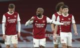 Alexandre Lacazette dari Arsenal, tengah, merayakan gol kedua timnya pada laga sepak bola Liga Premier Inggris antara Arsenal dan Tottenham Hotspur di Stadion Emirates di London, Inggris, Ahad, 14/3. (FOTO : AP/Nick Potts/Pool PA)