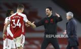 Manajer Arsenal Mikel Arteta menyapa Granit Xhaka dari Arsenal usai laga sepak bola Liga Premier Inggris antara Arsenal dan Tottenham Hotspur di Stadion Emirates di London, Inggris, Ahad, 14/3. (FOTO : AP/Julian Finney/Pool Getty)