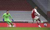 Alexandre Lacazette dari Arsenal mencetak gol dari titik penalti pada laga sepak bola Liga Premier Inggris antara Arsenal dan Tottenham Hotspur di Stadion Emirates di London, Inggris, Ahad, 14/3. (FOTO : AP/Nick Potts/Pool PA)
