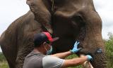 Dokter hewan Balai Konservasi Sumber Daya Alam (BKSDA) Aceh mengobati luka gajah jantan jinak yang bernama Meutuah akibat menggiring gajah liar di Conservation Response Unit (CRU) DAS Peusangan, Bener Meriah, Aceh, Minggu (14/3/2021). Tim BKSDA Aceh melakukan penggiringan kawanan gajah liar berjumlah lima ekor yang sejak sebulan terakhir memasuki pemukiman dan perkebunan warga. (FOTO : ANTARA/Irwansyah Putra)