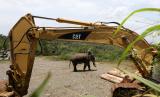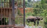 Seekor gajah jinak dari Conservation Response Unit (CRU) DAS Peusangan berjalan saat menangani konflik gajah dengan warga di Desa Negeri Antara, Bener Meriah, Aceh, Sabtu (13/3/2021). Balai Konservasi Sumber Daya Alam (BKSDA) Aceh mengerahkan tiga ekor gajah jinak yang didatangkan dari berbagai CRU untuk menggiring gajah-gajah liar yang memasuki permukiman dan perkebunan warga. (FOTO : Antara/Irwansyah Putra)