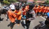 Polisi menggiring sejumlah tersangka saat ungkap kasus peredaran narkoba bulan Februari-Maret 2021 di Polresta Kediri, Jawa Timur, Selasa (16/3). Polresta Kediri berhasil mengamankan 41 tersangka dari 30 kasus narkoba dengan barang bukti terbanyak berupa 142.592 butir pil double L atau Triheksifenidil Hcl. (FOTO : ANTARA/Prasetia Fauzani)