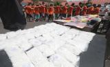 Kapolresta Bandara Soekarno Hatta Kombes Pol Adi Ferdian Saputra (tengah) beserta jajaran menunjukan barang bukti sabu seberat 6,7 kg saat rilis pengungkapan penyelundupan sabu jaringan antar provinsi, di Mapolres Bandara Soetta, Tangerang, Banten, Selasa (16/3). Pengungkapan ini berawal dari adanya informasi rencana transaksi penjualan narkoba di Terminal 2 Bandara Soekarno Hatta, para tersangka menyelundupkan sabu tersebut diletakan dalam kap mesin mobil. (FOTO : Antara/Muhammad Iqbal)