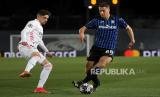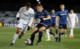 Bek Real Madrid Raphael Varane (kiri) berebut bola dengan gelandang Atalanta Mario Pasalic (kanan) pada laga leg kedua babak 16 besar Liga Champions antara Real Madrid dan Atalanta di stadion Alfredo Di Stefano, Madrid, Spanyol, Rabu (17/3) dini hari WIB. (FOTO : EPA-EFE/JuanJo Martin)