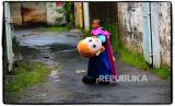 Pengamen cosplay Darmunah (75) menyusuri Jalan Ahmad Yani Bandung, Selasa (16/3). Wanita asal Cilacap ini 2 bulan terakhir menjadi badut jalanan dengan mengenakan kostum tokoh kartun Walt Disney Elsa dari film Frozen. Fenomena cosplayer jalanan ini menjamur pada masa pandemi. (FOTO : Yogi Ardhi/Republika)