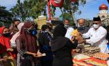 Bupati Aceh Barat Ramli MS (kanan) menyerahkan barang kebutuhan pokok kepada pembeli saat operasi pasar murah di Meulaboh, Aceh Barat, Aceh, Rabu (17/3/2021). Pemerintah Kabupaten Aceh Barat bekerja sama dengan Perum Bulog menyelenggarakan operasi pasar murah agar memudahkan warga memperoleh sembako dengan harga lebih rendah dari harga pasar. (FOTO : ANTARA/Syifa Yulinnas)