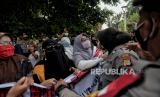 Simpatisan Rizieq Shihab memadati area Pengadilan Negeri Jakarta Timur saat sidang lanjutan kasus pelanggaran protokol kesehatan dengan terdakwa Rizieq Shihab di PN Jakarta Timur, Jumat (19/3). Sidang tersebut beragendakan pembacaan dakwaan terhadap Rizieq Shihab atas kasus pelanggaran protokol kesehatan. (FOTO : Republika/Thoudy Badai)