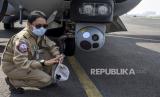 Test Pilot In Command dan Flight Instructor Capt Esther Gayatri memeriksa Pesawat terbang CN235-220 Maritime Patrol Aircraft (MPA) sebelum lepas landas pada acara Ferry Flight di Hanggar Fixed Wing PTDI, Kota Bandung, Jumat (19/3). (FOTO : REPUBLIKA/ABDAN SYAKURA)