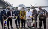 Direktur Utama PTDI Elfien Goentoro (tengah) dan KASAU Senegal General Papa Souleymane Sarr (ketiga kiri) bersama jajaran menggunting pita pada acara Ferry Flight di Hanggar Fixed Wing PTDI, Kota Bandung, Jumat (19/3). (FOTO : REPUBLIKA/ABDAN SYAKURA)
