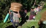 Warga beranjak pulang usai nyadran di Dusun Warangan, Pakis, Magelang, Jawa Tengah, Jumat (19/3). Tradisi nyadran dilakukan oleh warga di lereng Gunung Merbabu sebulan sebelum Ramadhan. Saat nyadran warga membersihkan makam, berdoa, dan makan bersama di lokasi sekitar makam. Tahun ini nyadran boleh dilakukan di makam, berbeda dengan tahun lalu tradisi ini hanya dilakukan di rumah imbas awal pandemi Covid-19. (FOTO : Wihdan Hidayat / Republika)