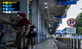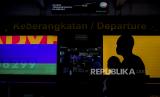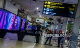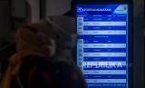 Sejumlah calon penumpang melintas di depan jadual keberangkatan pesawat di Bandara Halim Perdanakusma, Jakarta Timur, Sabtu (20/3). (FOTO : Republika/Putra M. Akbar)