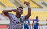 Pemain Persikabo 1973 Ahmad Nufiandani melakukan selebrasi usai mencetak gol ke gawang Arema FC pada pertandingan Piala Menpora di Stadion Manahan, Solo, Jawa Tengah, Ahad (21/3/2021). (FOTO : Antara/Mohammad Ayudha)