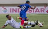Pemain Persikabo 1973 Guntur Triaji (kiri) menghadang pemain Arema FC KH Yudo (kanan) pada pertandingan Piala Menpora di Stadion Manahan, Solo, Jawa Tengah, Ahad (21/3/2021). (FOTO : Antara/Mohammad Ayudha)