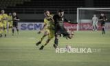 Pemain PSIS Semarang Rio Saputro (kiri) berebut bola dengan pemain Barito Putra Abrizal Umanialo (kanan) pada pertandingan Piala Menpora di Stadion Manahan, Solo, Jawa Tengah, Ahad (21/3/2021). (FOTO : Antara/Mohammad Ayudha)