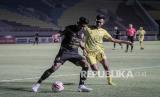 Pemain PSIS Semarang Rio Saputro (kiri) berebut bola dengan pemain Barito Putra Kahar Kalu (kanan) pada pertandingan Piala Menpora di Stadion Manahan, Solo, Jawa Tengah, Ahad (21/3/2021). (FOTO : Antara/Mohammad Ayudha)