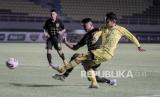 Pemain PSIS Semarang Fandi Eko Utomo (kanan) berebut bola dengan pemain Barito Putra Dandi Maulana Abdulhak (kiri) pada pertandingan Piala Menpora di Stadion Manahan, Solo, Jawa Tengah, Ahad (21/3/2021). (FOTO : Antara/Mohammad Ayudha)