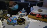 Pemilik rumah produksi Sari Donuts menyusun donat dengan motif COVID 19, di Bandar Lampung, Lampung, Senin (22/3/2021). Rumah produksi donat tersebut setiap hari memproduksi 500 buah donat dengan berbagai macam motif Covid-19 dengan harga jual Rp35 ribu sampai Rp65 ribu per kotak tergantung motif dan ukuran. (FOTO : ANTARA/Ardiansyah)
