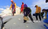 Sejumlah pekerja mengumpulkan garam ke dalam karung di desa Luwunggeusik, Krangkeng, Indramayu, Jawa Barat, Senin (22/3/2021). Pemerintah membuka kembali impor garam sebanyak 3 juta ton pada tahun ini. Hal itu berkaitan dengan kuantitas dan kualitas garam lokal. (FOTO : Dedhez Anggara/ANTARA )