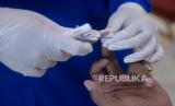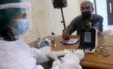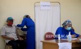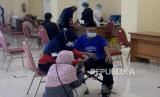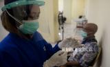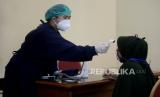 Petugas medis melakukan screening kesehatan kepada warga lansia penerima vaksin COVID-19 di GOR Pancoran, Jakarta, Selasa (23/3). Seketaris Daerah Provinsi DKI Jakarta, Marullah Matali mengharapkan vaksinasi Covid-19 untuk lansia dapat diselesaikan sesuai target yaitu 31 Maret 2021. Sebab, mereka merupakan kelompok rentan yang juga masuk dalam prioritas penerima vaksin di Jakarta.Prayogi/Republika (FOTO : Prayogi/Republika.)
