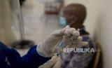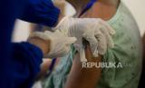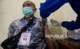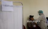 Vaksinator menyuntikan vaksin COVID-19 kepada warga lansia di GOR Pancoran, Jakarta, Selasa (23/3). Seketaris Daerah Provinsi DKI Jakarta, Marullah Matali mengharapkan vaksinasi Covid-19 untuk lansia dapat diselesaikan sesuai target yaitu 31 Maret 2021. Sebab, mereka merupakan kelompok rentan yang juga masuk dalam prioritas penerima vaksin di Jakarta.Prayogi/Republika (FOTO : Prayogi/Republika.)