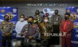 Kapolri Jenderal Listyo Sigit Prabowo (ketiga kiri) bersama Kakorlantas Polri Irjen Istiono, Menteri Perhubungan Budi Karya Sumadi, Ketua Mahkamah Agung Muhammad Syarifuddin dan MenPAN RB Tjahjo Kumolo (dari kiri Ke kanan) memberikan keterangan pers usai peresmian program penerapan tilang elektronik atau Electronic Traffic Law Enforcment (ETLE) Nasional di Gedung NTMC Korlantas Polri, Jakarta, Selasa (23/3). Program ETLE Nasional resmi diberlakukan yang tersebar 244 titik di 12 wilayah Polda di Indonesia sebagai upaya peningkatan program keamanan, keselamatan, ketertiban dan kelancaran berlalu lintas. Republika/Putra M. AKbar (FOTO : Republika/Putra M. Akbar)