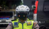 Polisi Lalu Lintas menggunakan helm yang dilengkapi kamera portabel pengawas tilang elektronik di Traffic Management Centre (TMC) Polres Pekalongan, Jawa Tengah, Selasa (23/3/2021). Polres Pekalongan menerapkan tilang elektronik atau Electronic Traffic Law Enforcement (ETLE) yang dilakukan serentak secara nasional dengan memasang kamera pengawas di empat titik di pusat kota dan pantura Kabupaten Pekalongan dan memasang kamera portabel yang terpasang di helm petugas polisi lalu lintas. (FOTO : Antara/Harviyan Perdana Putra)