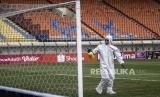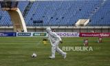 Pada masa jeda menjelang pertandingan petguas berpakaian alat pelindung diri (APD) menyemprotkan disinfektan di beberapa bagian lapangan, termasuk bola yang digunakan.