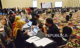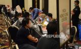 Peserta vaksinasi antre di meja konsultasi dokter saat pelaksanaan vaksinasi Covid-19 bagi para pedagang pusat perbelanjaan dan toko swalayan (retail), di Trans Convention Center, Kota Bandung, Rabu (24/3). Vaksinasi tersebut sebagai persiapan menjelang bulan Ramadan yang dipastikan akan terjadi peningkatan aktivitas. (FOTO : Edi Yusuf/Republika)