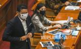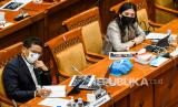 REPUBLIKA.CO.ID, JAKARTA -- Menteri Pariwisata dan Ekonomi Kreatif Sandiaga Salahudin Uno didampingi Wakil Menteri Angela Tanoesoedibjo mengikuti rapat kerja dengan Komisi X DPR di Kompleks Parlemen, Senayan, Jakarta, Kamis (25/3/2021).