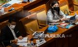 Wakil Menteri Angela Tanoesoedibjo (kanan) mengikuti rapat kerja dengan Komisi X DPR di Kompleks Parlemen, Senayan, Jakarta, Kamis (25/3/2021). Rapat tersebut membahas dampak pemotongan anggaran APBN TA 2021, sebesar Rp300 miliar sesuai Raker pada 26 Januari 2021 serta membahas isu-isu strategis pariwisata dan ekraf seperti hibah pariwisata, perkembangan peraturan turunan UU Ekraf, konsep destinasi wisata terintegrasi dengan destinasi prioritas dan super prioritas. (FOTO : Antara/Galih Pradipta)