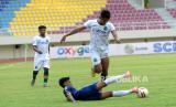 Striker PSIS Komarudin (kiri) berebut bola dengan gelandang Persikabo 1973 Roni Sugeng saat pertandingan penyisihan grup A Piala Menpora 2021 di Stadion Manahan, Solo, Jawa Tengah, Kamis (25/3). Pada pertandingan ini PSIS berhasil membenamkan Persikabo 1973 dengan skor 3-1. (FOTO : Wihdan Hidayat / Republika)