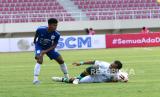 Gelandang PSIS Pratama Arhan menghadang penyerang Persikabo 1973 Dimas Drajad pada pertandingan penyisihan grup A Piala Menpora 2021 di Stadion Manahan, Solo, Jawa Tengah, Kamis (25/3). Pada pertandingan ini PSIS berhasil membenamkan Persikabo 1973 dengan skor 3-1. (FOTO : Wihdan Hidayat / Republika)