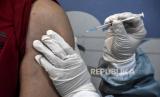 Vaksinator menyuntikan vaksin Covid-19 ke pekerja media di Gedung Bandung Planning Gallery, Jalan Aceh, Kota Bandung, Jumat (26/3). Sedikitnya 300 pekerja media menerima vaksin Covid-19 Sinovac dosis pertama pada pelaksanaan vaksinasi tahap kedua di Kota Bandung. Foto: Republika/Abdan Syakura (FOTO : REPUBLIKA/ABDAN SYAKURA)
