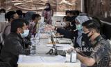 Sejumlah pekerja media menjalani tahap verifikasi dan pemeriksaan kesehatan sebelum disuntik vaksin Covid-19 di Gedung Bandung Planning Gallery, Jalan Aceh, Kota Bandung, Jumat (26/3). Sedikitnya 300 pekerja media menerima vaksin Covid-19 Sinovac dosis pertama pada pelaksanaan vaksinasi tahap kedua di Kota Bandung. Foto: Republika/Abdan Syakura (FOTO : REPUBLIKA/ABDAN SYAKURA)