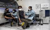 Sejumlah pekerja media disuntik vaksin Covid-19 di Gedung Bandung Planning Gallery, Jalan Aceh, Kota Bandung, Jumat (26/3). Sedikitnya 300 pekerja media menerima vaksin Covid-19 Sinovac dosis pertama pada pelaksanaan vaksinasi tahap kedua di Kota Bandung. Foto: Republika/Abdan Syakura (FOTO : REPUBLIKA/ABDAN SYAKURA)