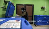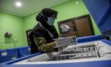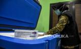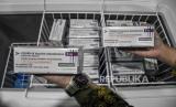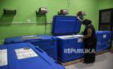 Petugas memeriksa vaksin Covid-19 AstraZeneca di Gedung Instalasi Farmasi Dinkes Kota Bandung, Jalan Supratman, Kota Bandung, Jumat (26/3). Dinas Kesehatan Kota Bandung menerima 750 vial vaksin Covid-19 AstraZeneca untuk pelaksanaan vaksinasi Covid-19 yang diperuntukkan anggota TNI dan Polri di Kota Bandung. Foto: Republika/Abdan Syakura (FOTO : REPUBLIKA/ABDAN SYAKURA)