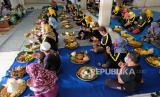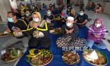 Sejumlah warga berdoa bersama saat tradisi Punggahan Pasar Legi di Parakan, Temanggung, Jateng, Jumat (26/3/2021). Tradisi yang dilaksanakan oleh pedagang pasar tradisional dalam menyambut bulan suci Ramadan tersebut sebagai wujud rasa syukur kepada Tuhan YME dan permohonan agar diberi kelancaran dan kesuksesan dalam berdagang (FOTO : ANIS EFIZUDIN/ANTARA FOTO)