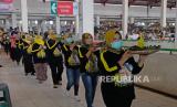 Sejumlah warga membawa nasi Tumpeng berjalan menyusuri lorong pasar saat tradisi Punggahan Pasar Legi di Parakan, Temanggung, Jateng, Jumat (26/3/2021). Tradisi yang dilaksanakan oleh pedagang pasar tradisional dalam menyambut bulan suci Ramadan tersebut sebagai wujud rasa syukur kepada Tuhan YME dan permohonan agar diberi kelancaran dan kesuksesan dalam berdagang. (FOTO : ANIS EFIZUDIN/ANTARA FOTO)