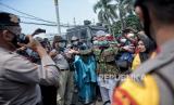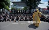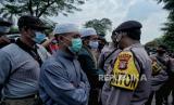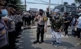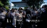 Petugas Kepolisian melakukan pengamanan saat berlangsungnya sidang lanjutan kasus pelanggaran protokol kesehatan dengan terdakwa Habib Rizieq Shihab di kawasan Pengadilan Negeri (PN) Jakarta Timur, Jakarta, Jumat (26/3). Sidang tersebut beragendakan pembacaan nota keberatan atau eksepsi. Republika/Thoudy Badai (FOTO : Republika/Thoudy Badai)