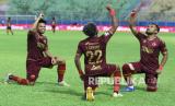 Pesepak bola PSM Makassar Yakob Sayuri (tengah) melakukan selebrasi bersama Zulham Zamrun (kanan) dan Saldi (kiri) usai mencetak gol di gawang Bhayangkara Solo FC dalam pertandingan Piala Menpora Grup B di Stadion Kanjuruhan, Malang, Jawa Timur, Sabtu (27/3/2021). PSM Makassar menahan imbang Bhayangkara Solo FC dengan skor akhir 1-1. (FOTO : Antara/Ari Bowo Sucipto)