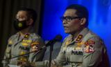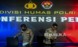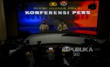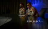 Kadiv Humas Mabes Polri Irjen Pol Argo Yuwono (kanan) bersama Karopenmas Mabes Polri Brigjen Rusdi Hartono memberikan keterangan pers terkait bom bunuh diri di Gereja Katedral Makassar di Jakarta, Ahad (28/3). Kepolisian menjelaskan kejadian ledakan bom di  depan pintu gerbang Gereja Katedral Makassar, Sulawesi Selatan, diduga dilakukan oleh dua orang yang berboncengan dengan sepeda motor yang menyebabkan 14 orang mengalami luka-luka. (FOTO : Republika/Putra M. Akbar)