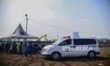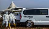Mobil ambulans yang membawa jenazah pasien Covid-19 saat tiba di TPU Rorotan, Jakarta, Ahad (28/3). (FOTO : Republika/Putra M. Akbar)