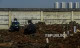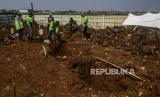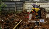 Petugas menggali lubang makam untuk jenazah pasien Covid-19 di TPU Rorotan, Jakarta, Ahad (28/3). (FOTO : Republika/Putra M. Akbar)