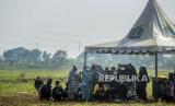 Sejumlah keluarga dan kerabat jenazah pasien Covid-19 saat berdoa di TPU Rorotan, Jakarta, Ahad (28/3). (FOTO : Republika/Putra M. Akbar)